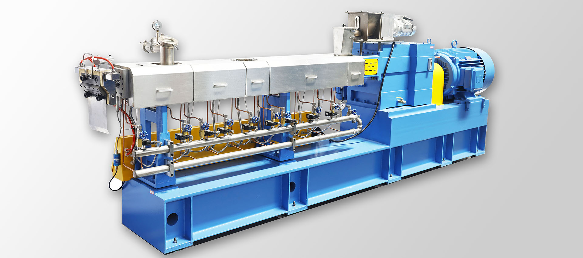 TPE,TPE這種改性塑料材料我們又把他叫作熱塑性彈性體材料。彈性體塑料擠出機(jī)和普通的塑料擠出機(jī)所用到的螺桿設(shè)計是不一樣的,因為我們常見的TPE材質(zhì)塑化性能要比普通PVC塑料材質(zhì)要差一些。所以我們常見的熱塑性彈性體擠出機(jī)從外觀看要比普通塑料擠出機(jī)要長一些。這是因為我們要加長塑料的塑化時間來保證產(chǎn)品的生產(chǎn)質(zhì)量。所以我們看到的熱塑性彈性體擠出機(jī)的長度要長一些。TPE塑料產(chǎn)品在生產(chǎn)的時候和其它塑料的生產(chǎn)工藝一樣,都是要先把原材料生產(chǎn)成我們所需要的顆粒后才可以再把顆粒加工成我們所需要的產(chǎn)品形狀。比如說彈性體密封條的生產(chǎn),熱塑性彈性體管的生產(chǎn)生產(chǎn)工藝都是這樣的。我們在選擇設(shè)備生產(chǎn)的時候一定要確定產(chǎn)品的材